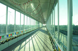 Новый надземный пешеходный переход отвечает самым современным стандартам. При строительстве были использованы высококачественные строительные материалы и оборудование. Общая длина перехода составляет 61 метр, ширина - 3,5, а высота над проезжей частью дороги - 5,1 метра. Это также создает условия для удобного движения пользующихся дорогой крупных автомобилей.