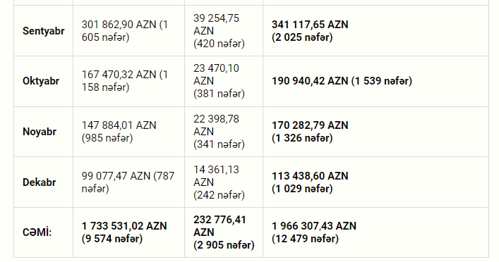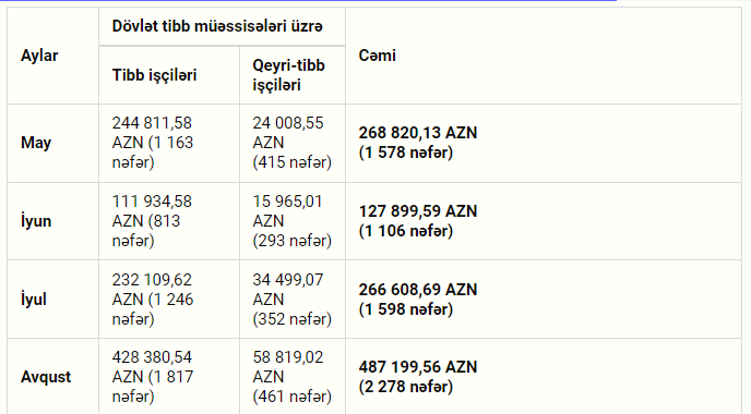 Agnetlikdən Day.Az-a verilən məlumata görə, tibb və qeyri-tibb işçilərinə qeyd edilən aylar üzrə ödənilən müddətli əlavələrin məbləği aşağıdakı kimidir: