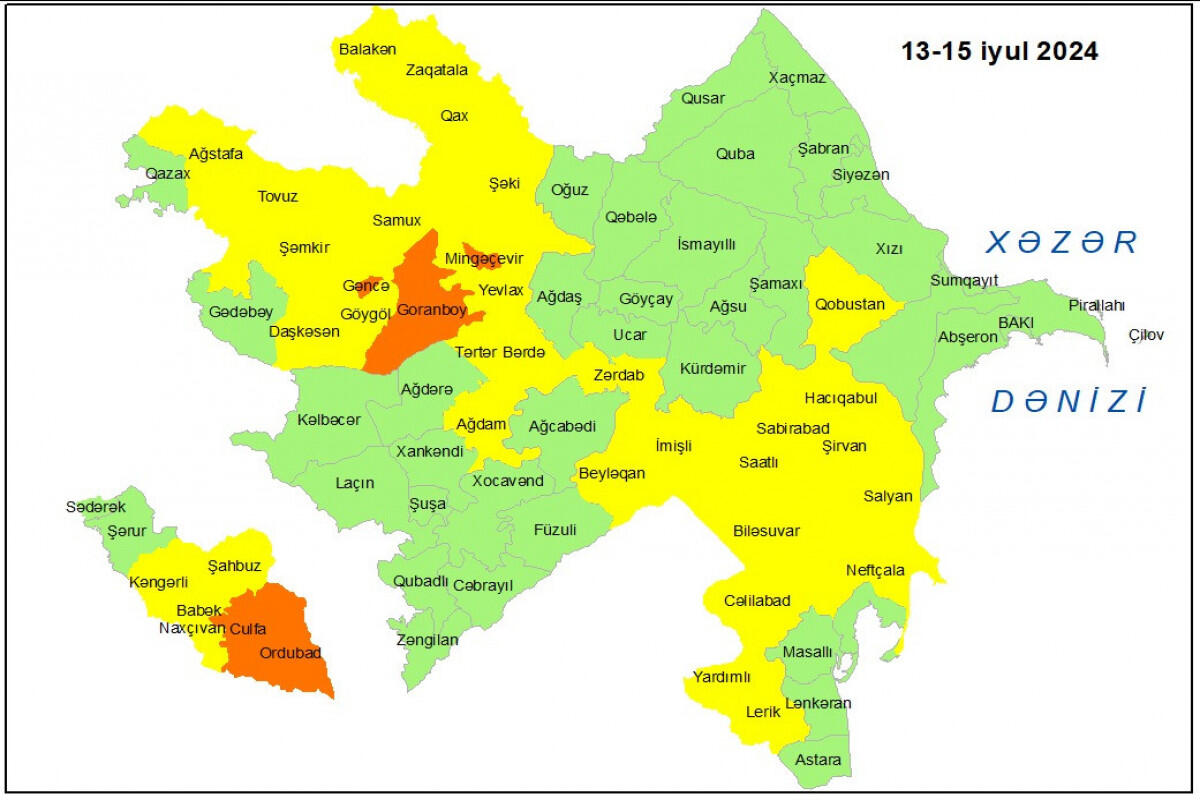 İyulun 13-15-də bölgələrdə gözlənilən fasilələrlə küləkli hava şəraiti ilə bağlı Milli Hidrometeorologiya Xidməti tərəfindən sarı və narıncı xəbərdarlıq verilib.