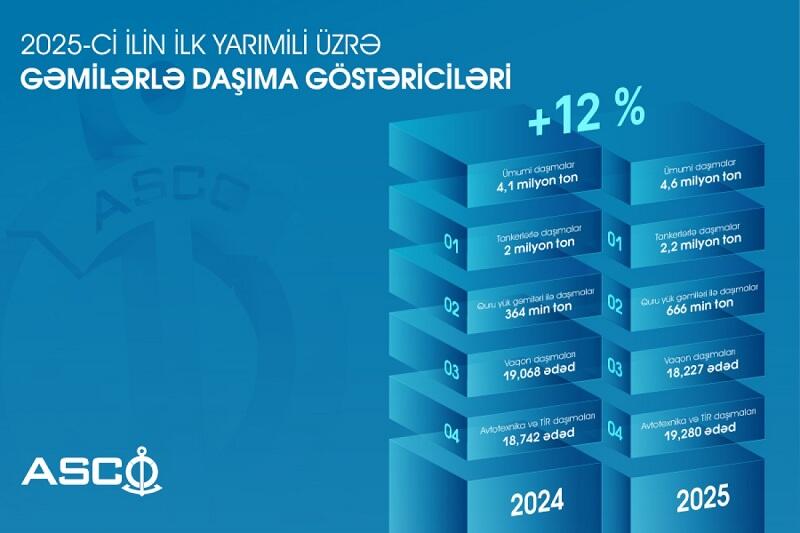 Bildirilib ki, AZCON Holding şirkətlərindən olan ASCO-nun gəmiləri ilə həyata keçirilən yükdaşımalar 2025-ci ilin yanvar-iyun aylarında ötən ilin eyni dövrü ilə müqayisədə 12 faiz artaraq 4,1 milyon tondan 4,6 milyon tona yüksəlib.