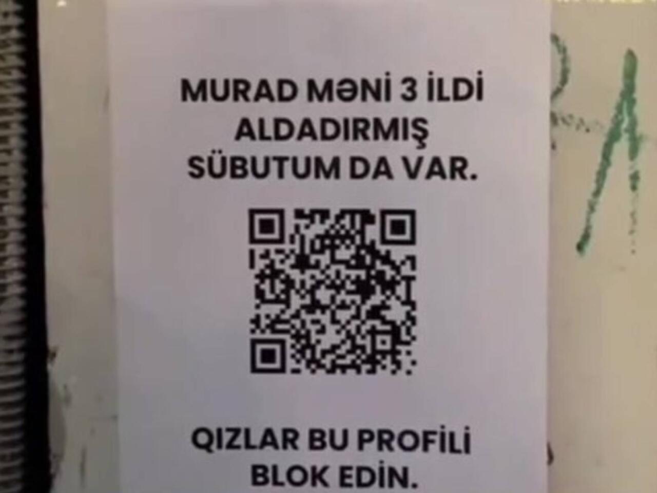 "Qızlar, Murad məni 3 ildir aldadırmış, sübutum da var. Onun profilini hər yerdə blok edin", - deyə çap edilən A4 vərəqində yazılıb.