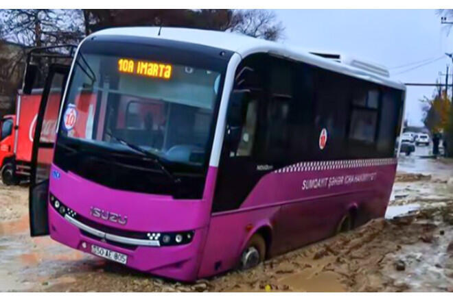 Sumqayıtda avtobus palçıqlı yolda batdı - VİDEO