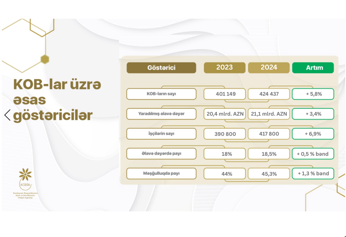 Dövlət Statistika Komitəsinin məlumatına əsasən 2024-cü ildə KOB-ların sayı 424437 olub ki, bu əvvəlki illə müqayisədə 5,8% çoxdur. 2023-cü illə müqayisədə ötən il KOB-ların yaratdığı əlavə dəyərin həcmi 3,4% artaraq 21,1 mlrd. manat təşkil edib. 2023-cü ildə KOB subyektlərində çalışan işçilərin sayı 390 800 nəfər olduğu halda, ötən il bu göstərici 417 800 nəfər olub. Bu isə 6,9% artım deməkdir. Qeyd edilən artım fonunda KOB-ların məşğulluqdakı payı 45,3%-ə yüksəlib.