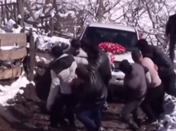 Görüntülərdən aydın olur ki, gəlin maşını dik yamacı qalxa bilmədiyi üçün ona kənd sakinləri köməklik edir.
