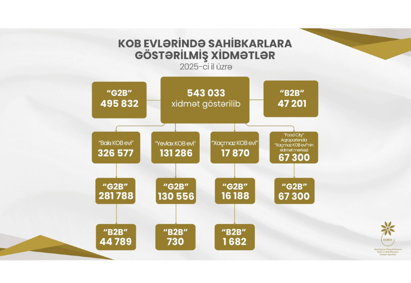 2025-ci ildə sahibkarlara vahid məkanda xidmətlərin göstərildiyi KOB evlərində ümumilikdə 543 033 xidmət göstərilib. Bu xidmətlərin 327 minə yaxını "Bakı KOB evi"nin, 131 mindən çoxu "Yevlax KOB evi"nin, 18 minə yaxını "Xaçmaz KOB evi"nin, 67 mindən çoxu isə "Xaçmaz KOB evi"nin "Food City" Aqroparkında yerləşən xidmət mərkəzinin payına düşür.