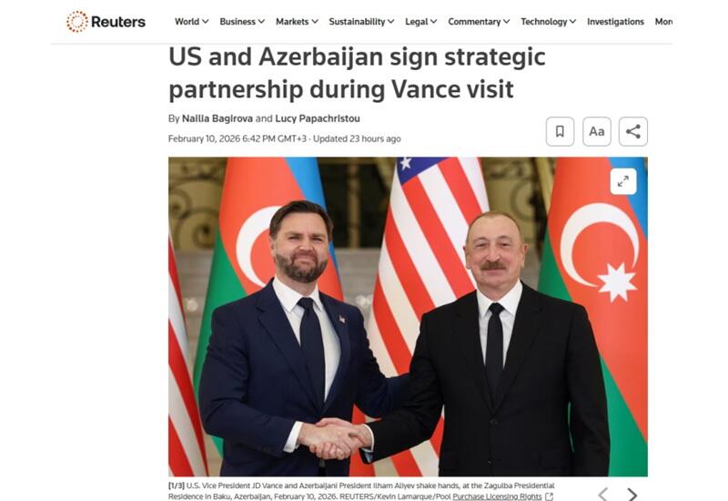 Bununla yanaşı, "Reuters"də dərc olunmuş "ABŞ və Azərbaycan Vensin səfəri çərçivəsində strateji tərəfdaşlıq müqaviləsi imzalayıblar" sərlövhəli yazıda qeyd olunur ki, Azərbaycan Prezidenti İlham Əliyev mətbuata birgə bəyanat zamanı ABŞ və Azərbaycan arasında münasibətlərin bu gün tamamilə yeni mərhələyə qədəm qoyduğunu deyib. Yazıya əsasən, Vens bildirib ki, ABŞ Azərbaycana ərazi sularını qorumaq üçün gəmilər göndərəcək. Vurğulanır ki, Xartiya ilk dəfə avqust ayında Vaşinqtonda Prezident İlham Əliyevlə Prezident Donald Tramp arasında danışıqlarda təqdim olunub.