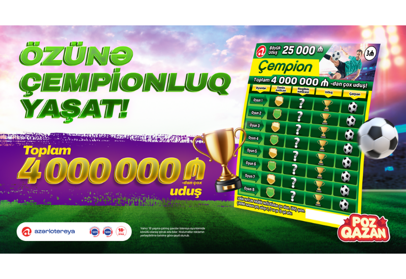 Ölkənin lotereya təşkilatçısı və idman mərc oyunları operatoru "Azərlotereya" yeni "Poz-Qazan" oyunu "Çempion"u təqdim edir.