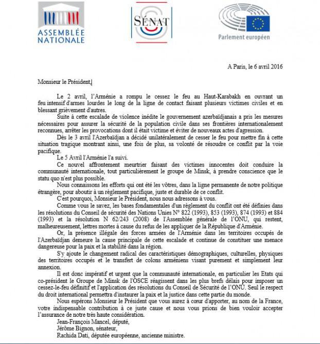 Aprelin 8-də bir qrup fransız senator və deputatı Ermənistanın son günlər atəşkəs rejimini pozması, sərhədyanı bölgələrdə Azərbaycanın dinc əhalisini intensiv atəşə tutması ilə əlaqədar Prezident Fransua Ollanda məktub ünvanlayıb.