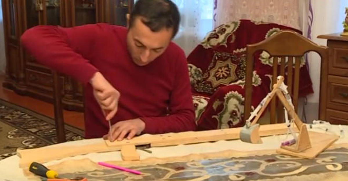 ARB 24 xəbər verir ki, ilk əl işi ekskavatordur. O, bu modeli şpris, taxta və nazik borulardan düzəldib. Çəkisi qədər də yük götürmək qabiliyyətinə malikdir. Hərəkət trayektoriyası da real texnikadan fərqlənmir.