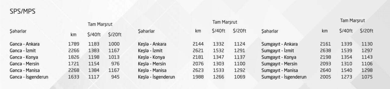 Qeyd edək ki, cədvəldə göstərilən qiymətlər hər iki istiqamətdə eynidir və tariflərə konteynerlərin ayrılması daxil deyil.