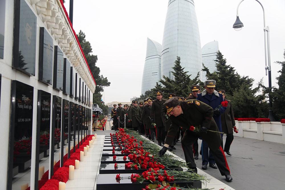 Azərbaycan Respublikası Müdafiə Nazirliyinin rəhbərliyi və şəxsi heyəti 20 Yanvar - Ümumxalq Hüzn Günü ilə əlaqədar Şəhidlər xiyabanını ziyarət edib.