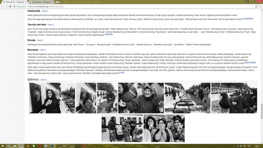 "Wikipedia.org" beynəlxalq elektron ensiklopediyasının özbəkdilli versiyasında Azərbaycan xalqının tarixinə faciə və qəhrəmanlıq səhifəsi kimi yazılmış "Qara Yanvar" adlı bölmə yaradılıb.