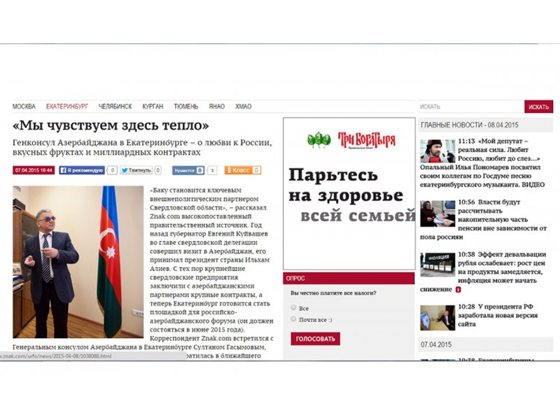 Корреспондент агентства "Znak" встретился с генеральным консулом Азербайджана в Екатеринбурге Султаном Гасымовым, чтобы узнать о том, как южнокавказская страна превратилась в ближайшего друга свердловчан, - как передает Day.Az со ссылкой на АЗЕРТАДЖ, об этом пишет российское информационное агентство.