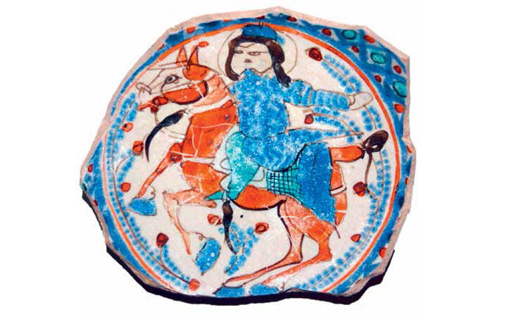 Заслуживают внимания два фрагмента тонкостенной пиалы. На одном фрагменте сохранилось изображение молодого всадника с округлым лицом, большими миндалевидными глазами, спадающими по плечам черными волосами. Следует отметить, что в армии сельджуков бойцы первого и второго года службы не носили усов и бороды.