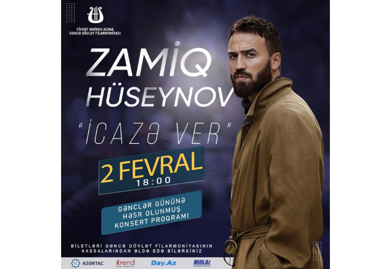 В Гянджинской государственной филармонии имени Фикрета Амирова, 2 февраля в 19.00, состоится концерт популярного эстрадного исполнителя Замига Гусейнова под названием "İcazə ver" (Разреши), сообщает Day.Az.