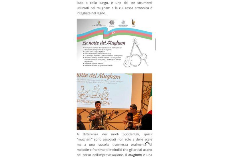 Итальянский портал Eurasiaticanews опубликовал статью "La musica Mugham patrimonio UNESCO a Roma" ("Объект Всемирного наследия ЮНЕСКО - мугам в Риме").