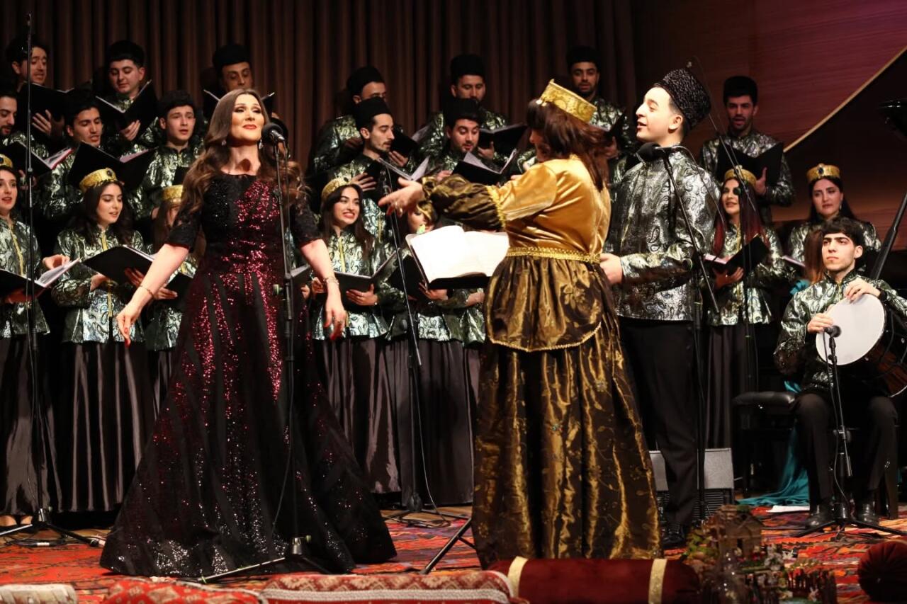 Ведущий вечера Салех Багиров создавал живую и непринуждённую атмосферу, шутил и подбадривал публику, а народный артист Эйюб Ягубов и заслуженная артистка Диляра Алиева вместе с хором добавили программе особую праздничную энергию. Каждый номер сопровождался национальными танцами и театрализованными сценками, которые усиливали впечатление от музыки и создавали эффект настоящего праздника на сцене.