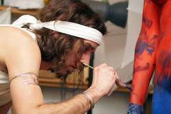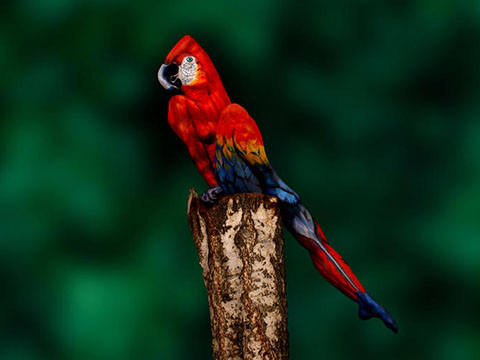 Это не попугай. Это также не ара. Фактически - это человек, тело которого было разрисовано к Чемпионату мира по бодиарту 2012 художником по бодиарту Джоханнсом Стеттером.
