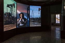 "Союз Огня и Воды", параллельный проект под руководством бывшей сотрудницы Sotheby's, а ныне куратор-директора Пространства Современного Искусства YARAT Суад Гараевой, стал настоящим откровением. Отлично продуманная и основанная на оригинальной идее об исторической связи Баку и Венеции, эта экспозиция в роскошном Палаццо Барбаро (в нем в свое время жил венецианский посол, посетивший и описавший в своих трудах многие азербайджанские города) переносит зрителя одновременно в два города. Два художника, Алмагюль Менлибекова и Рашад Алакбаров, попытались продемонстрировать связь между городами, что они и сделали с большим мастерством и эмоциональностью. Игра теней, отражений и зеркал напоминала миражи, оптические иллюзии становились носителями сложной символики и политических посылов. Со слов Суад: "Важнее всего в нашей выставке то, как художественная инсталляция вместе с самой архитектурой Палаццо Барбаро увлекают зрителя в удивительное путешествие, полное открытий". Меня более всего привлекли остроумные проекции в форме окон, в которых демонстрировали азербайджанские морские виды с нефтяными вышками вдалеке.
