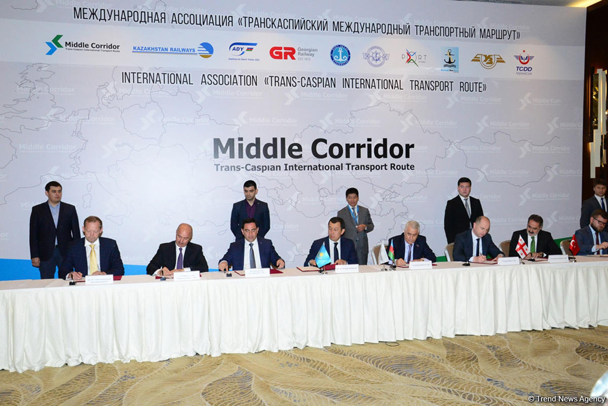 Участники объединения юридических лиц "Международная ассоциация "Транскаспийский международный транспортный маршрут"" подписали итоговый протокол Общего собрания ТМТМ в Баку во вторник.