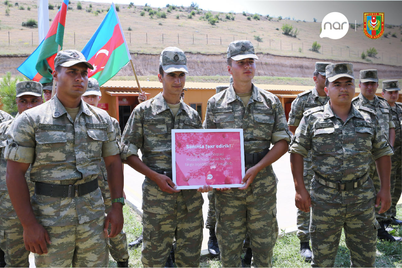 Отметим что в марте прошлого года, Nar вместе с министерством обороны организовал встречу более 100 родителей из различных районов страны с их сыновьями, проходящими службу в одной из частей прифронтовой зоны. Благодаря этой праздничной встрече, прошедшей при поддержке министерства обороны, родители получили возможность отпраздновать Новруз байрамы вместе со своими детьми, проходящими службу на фронте.