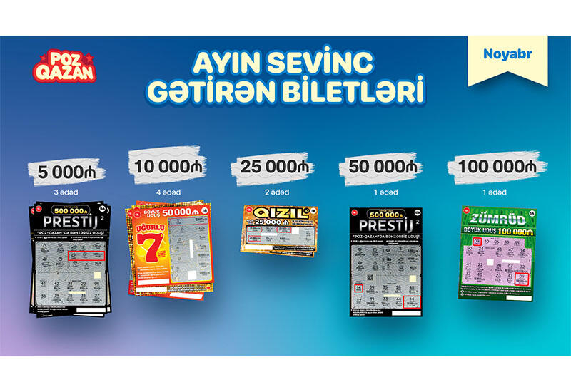 Qeyd edək ki, "Poz-Qazan" oyunlarında 25 000-dən 500 000 manatadək böyük uduşlar şanslı qaliblərin yolunu gözləyir. Biletləri "Azərlotereya" satış nöqtələri və "Misli" məntəqələri, "Azərpoçt" şöbələri, şəhərimizin market və köşklərindən əldə etmək, həmçinin "Wolt"dan sifariş vermək mümkündür.