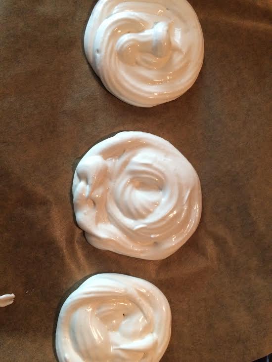 Распределяем меренгу прямо ложкой в каждом круге так, чтобы серединка была ниже "стенок". Выпекаем меренгу в течение до одного часа, в разогретой до 100 градусов духовке. Ее готовность можно определить на вид -она должна быть белая, но покрытая мелкими трещинками.