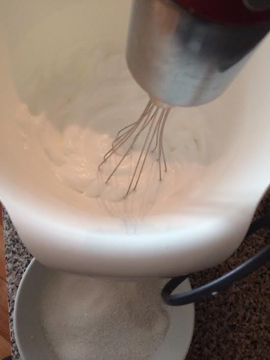 Яичные белки и несколько капель лимонного сока взбиваем миксером на средней скорости до мягких пиков. Не переставая взбивать, добавляем постепенно сахар и продолжим взбивать до твердых пиков.