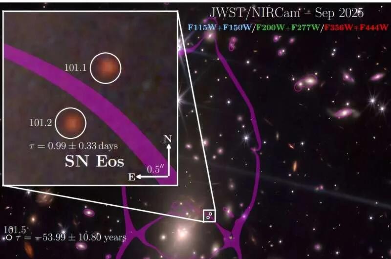 Под руководством Дэвида А. Коултера из Университета Джонса Хопкинса астрономы недавно обнаружили одну из древнейших известных сверхновых типа II. Специалисты применили метод гравитационной линзы, позволяющий получать многократные увеличенные изображения объектов, находящихся далеко за пределами возможностей обычного наблюдения. SN Eos впервые заметили благодаря снимкам космического телескопа, сделанным 1 сентября 2025 года в области галактики MACS 1931.8−2635. Ее назвали в честь греческого божества Эос - богини утренней зари.