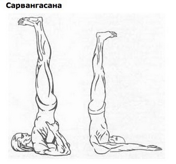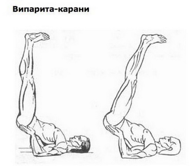 Существуют два способа выполнения этого упражнения. Они называются Сарвангасана и более простой вариант - Випарита-карани.