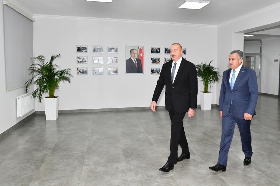 Президент Ильхам Алиев ознакомился с условиями, созданными в кабинетах дошкольной подготовки, начальных классов, биологии, допризывной военной подготовки, STEAM-центре, кабинетах физики и информатики, химической лаборатории, спортивном зале и столовой нового учебного заведения.