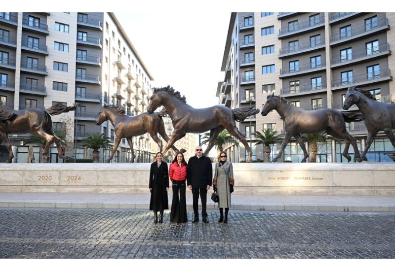 Президент Ильхам Алиев, Первая леди Мехрибан Алиева и их дочери сначала ознакомились со скульптурным комплексом "Карабахские скакуны". Этот комплекс посвящен нашей Победе в Отечественной войне и является символом национального наследия. Он установлен на площади "Карабахские скакуны" и включает в целом семь статуй карабахских скакунов - "Солтан", "Урек", "Серейин", "Айпара", "Шохрат", "Отгам" и "Йылдырым".