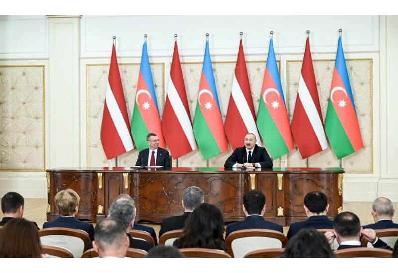 Президент Азербайджанской Республики Ильхам Алиев и Президент Латвийской Республики Эдгарс Ринкевичс выступили с заявлениями для прессы.