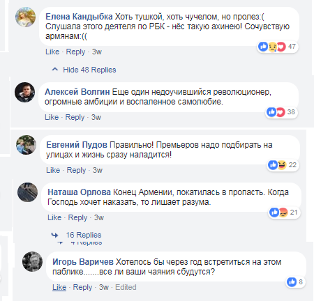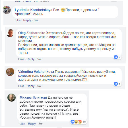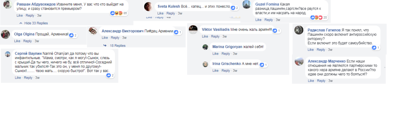 Российские пользователи соцсетей издеваются над якобы народной революцией в Армении, над потугами новой власти казаться большими европейцами, чем они есть. Действительно, в начале 21-го века в Армении выбрали премьером первого встречного. В Армении выбирают премьерами любого, кто выйдет на улицу? - иронизируют пользователи соцсетей. А самого Никола Пашиняна называют неучем.