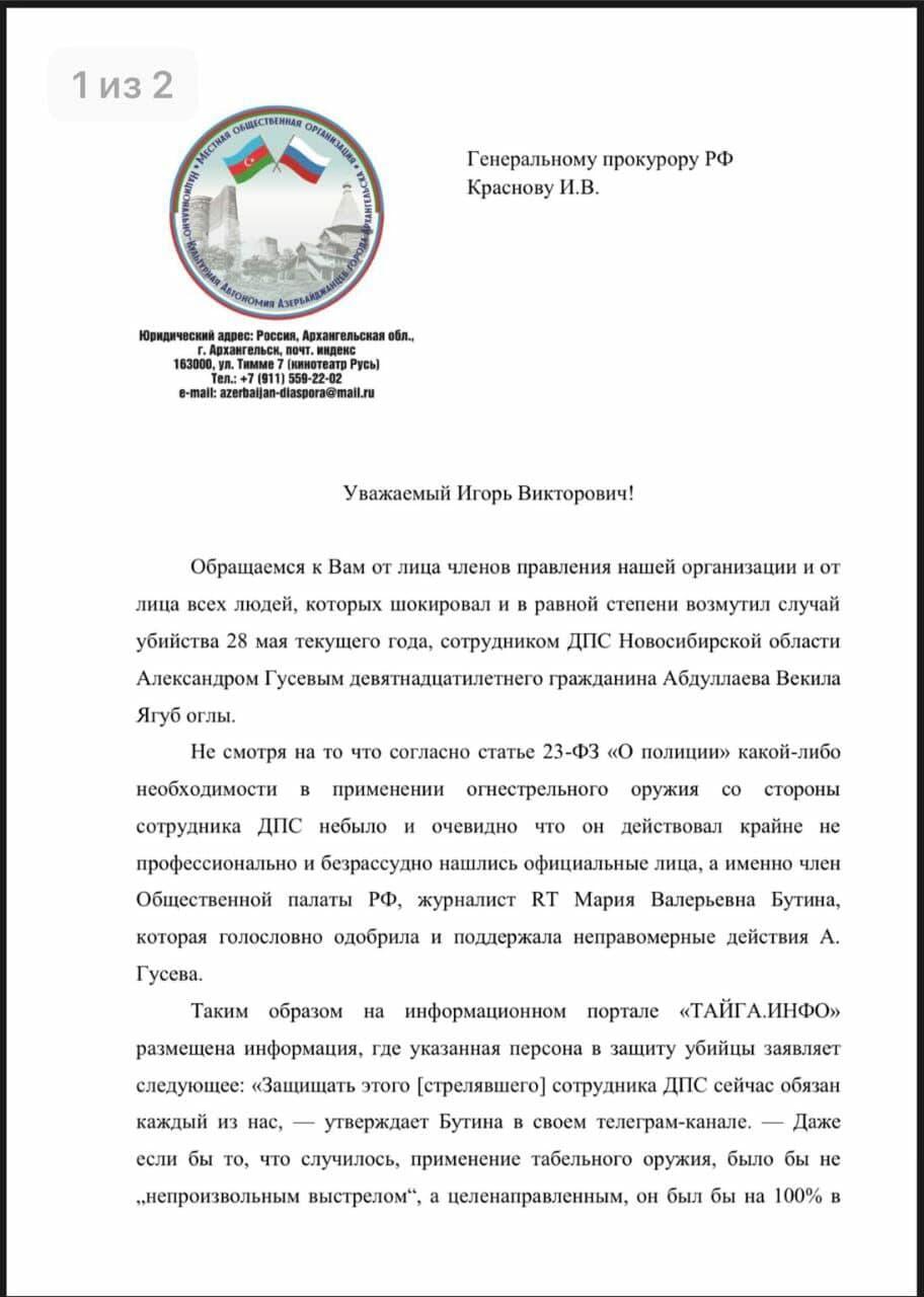 Азербайджанская диаспора Архангельской области обратилась к генеральному прокурору России Игорю Краснову в связи с убийством 19-летнего азербайджанца Векила Абдуллаева под Новосибирском, сообщает Day.Az.