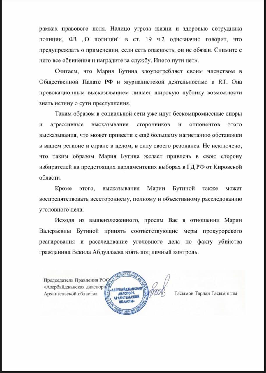 Азербайджанская диаспора Архангельской области обратилась к генпрокурору России - в связи с убийством азербайджанца