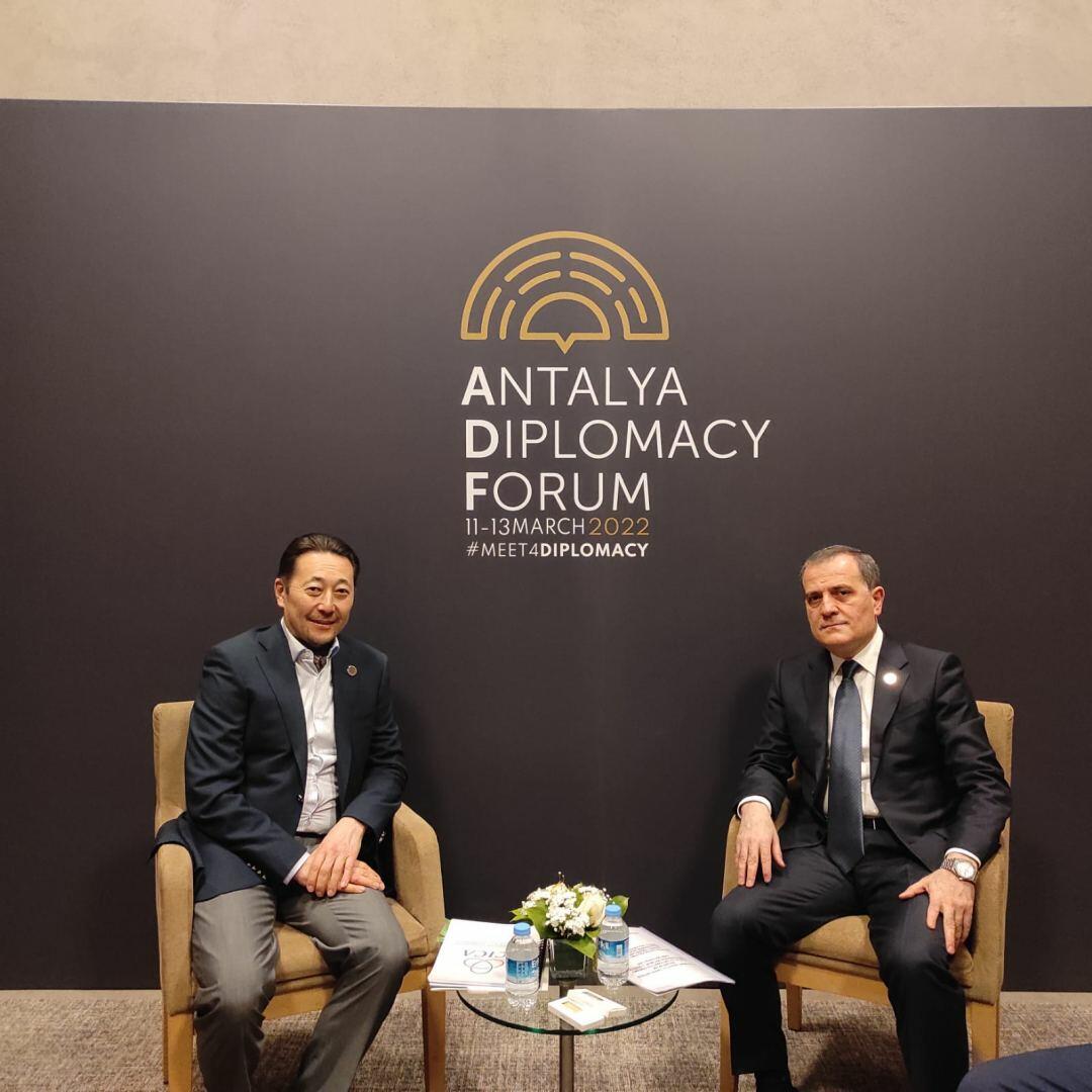 Министр иностранных дел Азербайджана Джейхун Байрамов в рамках участия в Дипломатическом форуме в Анталье встретился с исполнительным директором Совещания по взаимодействию и мерам доверия в Азии (СВМДА) Кайратом Сарыбаем.