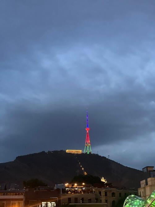 8 мая телевизионная башня и "Мост Мира" над рекой Кура, расположенные в самом высоком месте Тбилиси - парке Мтацминда, окрасились в цвета азербайджанского флага.