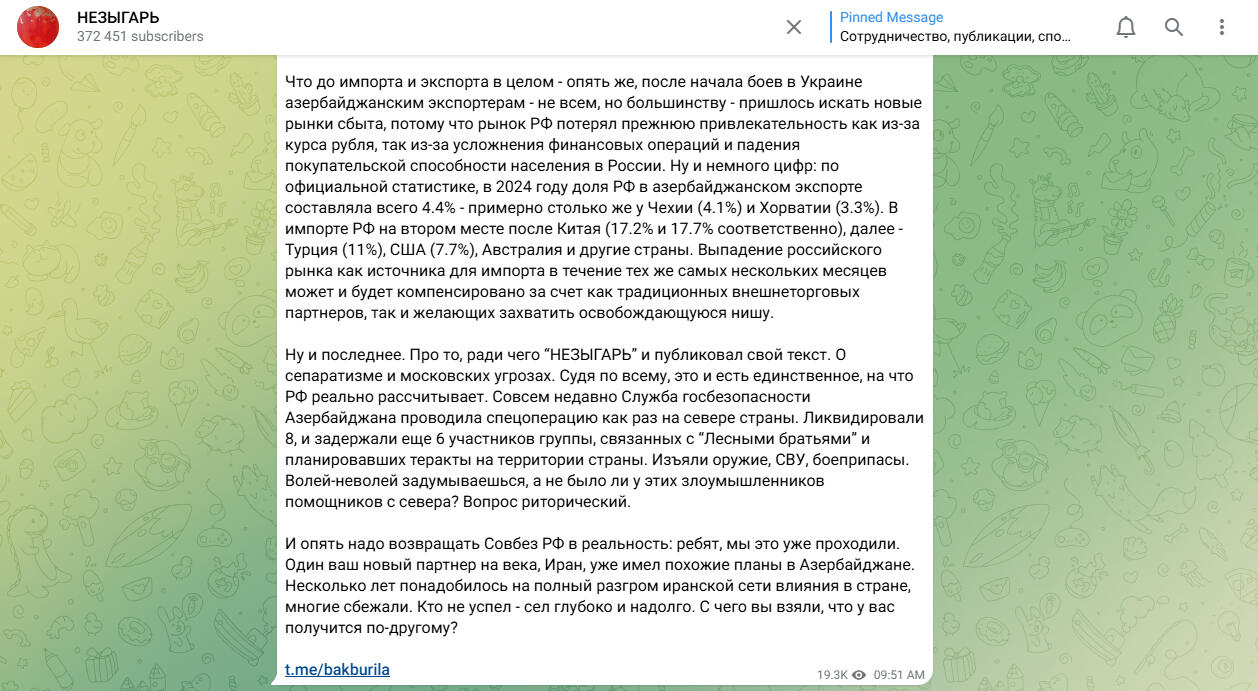 В Телеграм-канале "НЕЗЫГАРЬ" был опубликован текст с обзором кризиса в отношениях между РФ и Азербайджаном, содержавший то ли анонс, то ли разного рода намеки на "меры", которые может предпринять Москва. В полемику с одним из крупнейших российских онлайн-ресурсов вступил канал "Бакинский Бурила": домыслы россиян были разобраны и опровергнуты по пунктам.