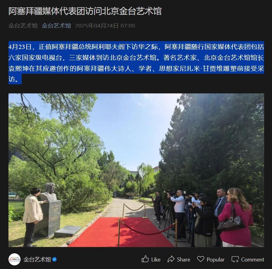 Сообщается, что 23 апреля в ходе визита Президента Ильхама Алиева в Китай, сопровождающая его делегация азербайджанских национальных СМИ, включавшая представителей шести национальных телеканалов и трех средств массовой информации, посетила музей. Азербайджанские журналисты побеседовали с директором музея Цзиньтао Юанем Сикунем. Беседа состоялась перед скульптурой Низами Гянджеви, великого азербайджанского поэта, ученого и мыслителя, созданной профессором Юанем.