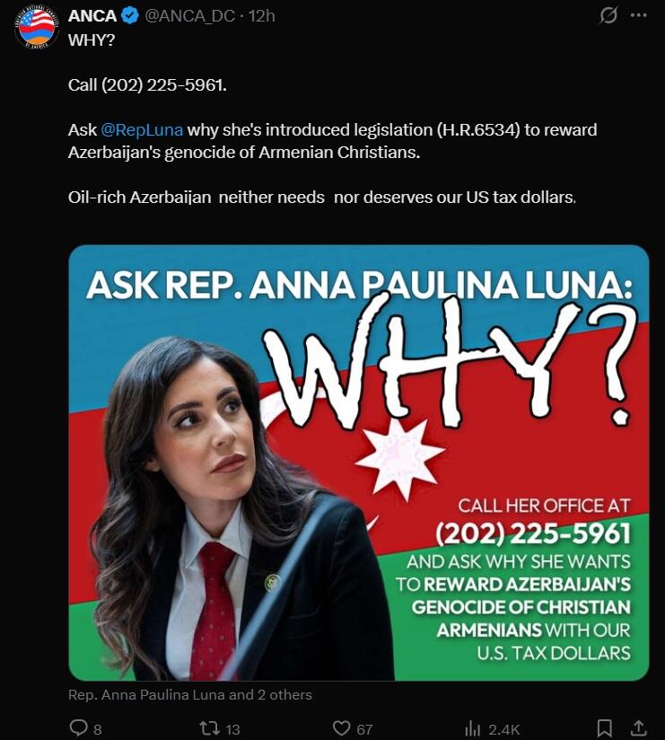 "ПОЧЕМУ? Звоните, требуйте от Паулины Луны почему она внесла законопроект, вознаграждая Азербайджан за геноцид армянских христиан. Богатый нефтью Азербайджан не достоин денег американских налогоплательщиков".