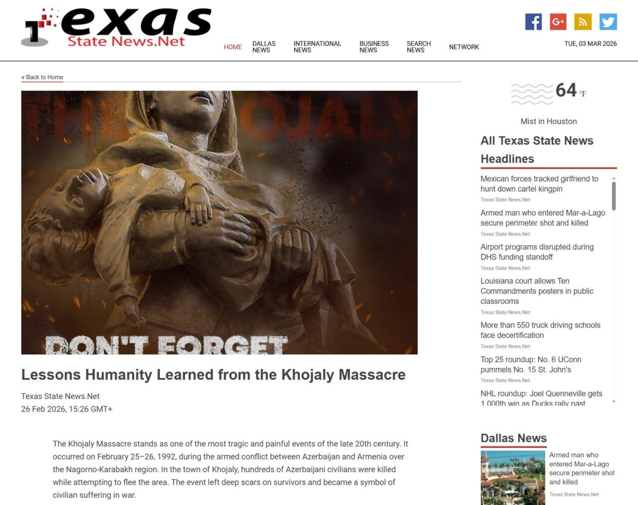 На американском сайте Texas State News.Net опубликована статья, посвященная 34-й годовщине Ходжалинского геноцида. Автором материала является руководитель Американо-Азербайджанского интеграционного центра (USACI) Самир Новрузов.