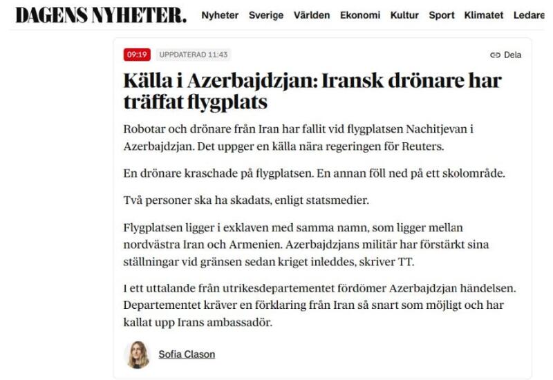 Шведское издание Dagens Nyheter сообщает, что власти Азербайджана заявили о намерении ответить после ударов беспилотников по территории страны.