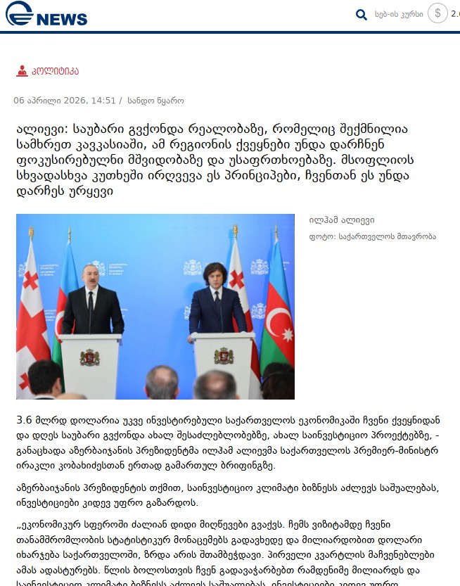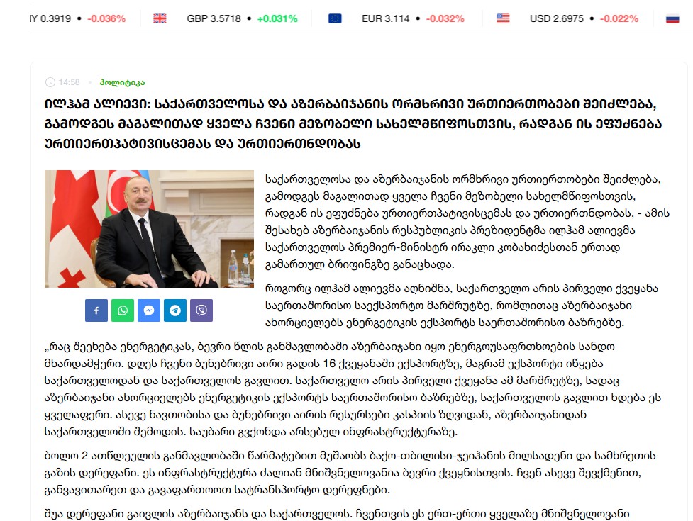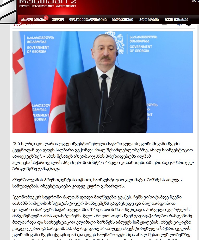Primitime.ge пишет, что в выступлении Президента Азербайджана было выражено удовлетворение более динамичным развитием отношений между двумя странами. Сообщается, что Азербайджан и Грузия поддерживают территориальную целостность, суверенитет и неприкосновенность границ друг друга во всех международных организациях. Так было всегда и так будет в будущем.