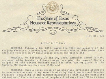 В результате ежегодной кампании сети азербайджанцев в США (USAN), палата представителей штата Техас приняла резолюцию о признании геноцида в Ходжалы.