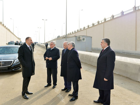 Глава государства был проинформирован о технических параметрах дорожной развязки. Было отмечено, что на этой развязке строятся три тоннеля, мост и два подземных пешеходных перехода. Протяженность моста составит 630 метров. Согласно проекту на развязке строятся подъездные и надтоннельные дороги. После сдачи этой развязки в эксплуатацию автомобили смогут беспрепятственно двигаться по проспекту Зии Буниятова в направлении круга 20 Января и площади Гэлэбэ. Кроме того, развязка обеспечит выезд транспортных средств со стороны круга 20 Января и площади Гэлэбэ в противоположном направлении - на проспект Зии Буниятова. А с моста на этой развязке автомобили смогут беспрепятственно двигаться через улицу Абдулвахаба Саламзаде в направлении улицы Рашида Мамедова и обратно. На всех строящихся дорожных развязках и путепроводах заменены коммуникационные системы, в том числе водные, газопроводные линии, линии связи и стока дождевых вод, создана новая дренажная система. Ввод в эксплуатацию нового гигантского сооружения еще раз подтверждает, что работа, проводимая в столице в области устранения плотности движения транспорта, приобрела устойчивый характер. Успешная реализация таких проектов вновь доказывает, что главная цель осуществляемых в стране мероприятий социальной направленности заключается в обеспечении удобства населения.