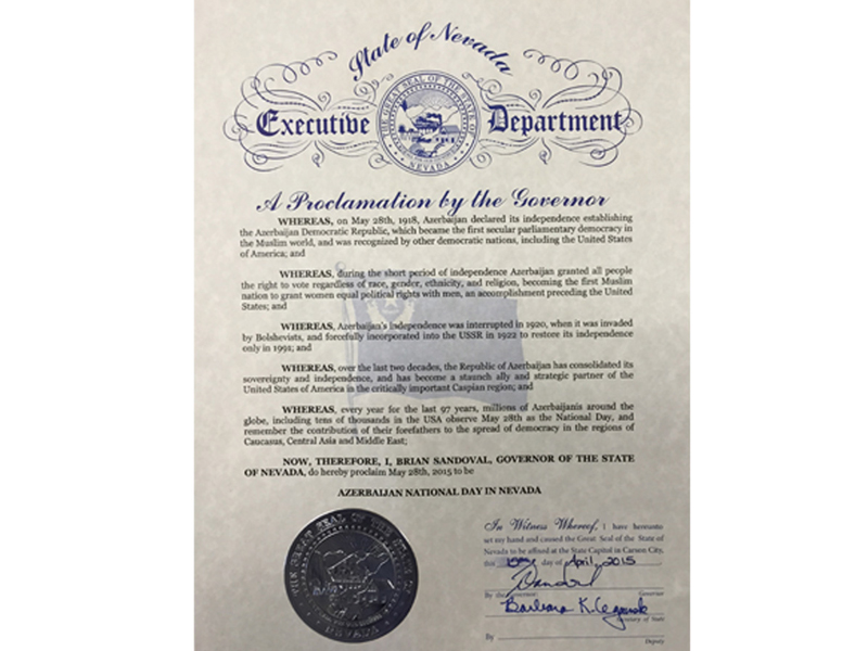 Американский штат Невада объявил 28 мая Национальным днем Азербайджана. Декларацию об этом подписали губернатор и госсекретарь штата Брайан Сандовал и Барбара Чегавски.