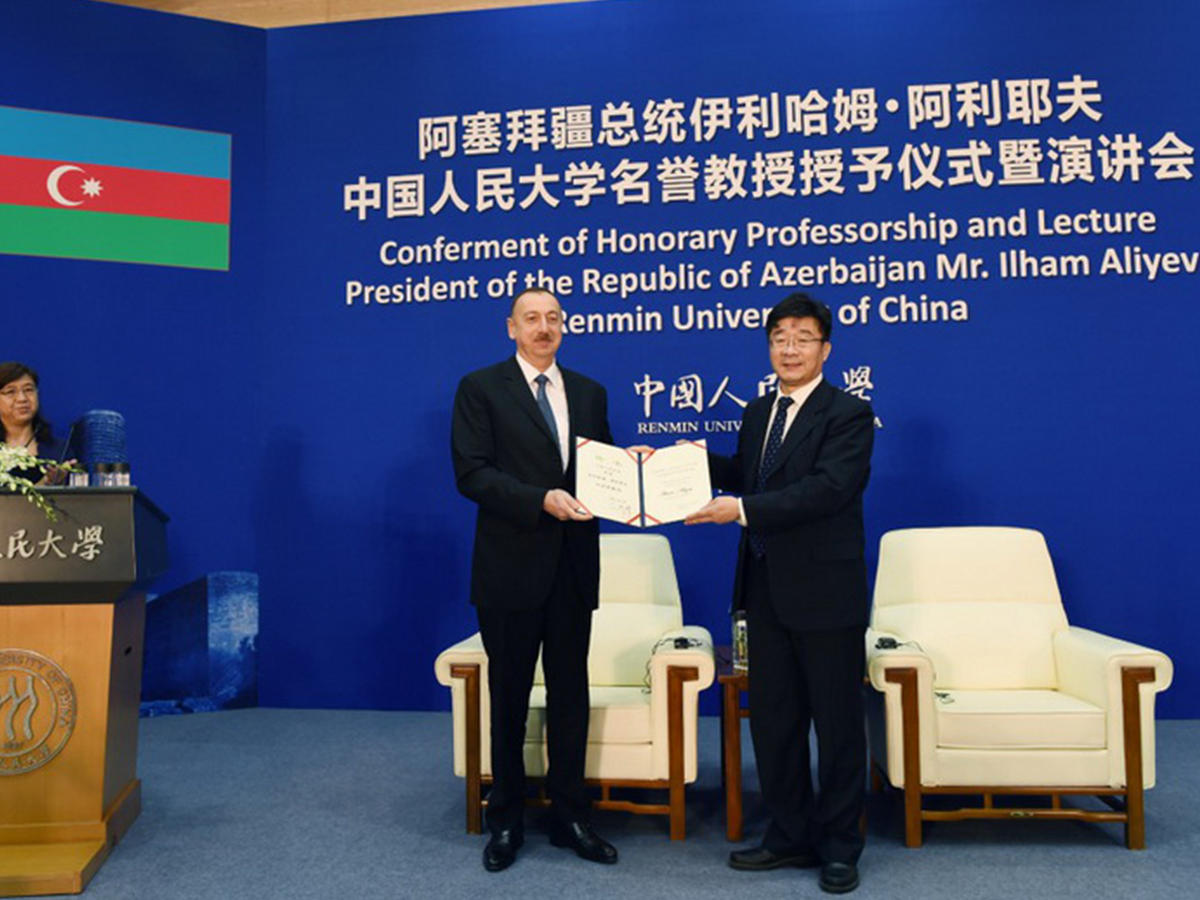 11 декабря состоялась церемония вручения Президенту Азербайджанской Республики Ильхаму Алиеву, находящемуся с государственным визитом в Китайской Народной Республике, диплома Почетного профессора по истории Университета Ренмин.