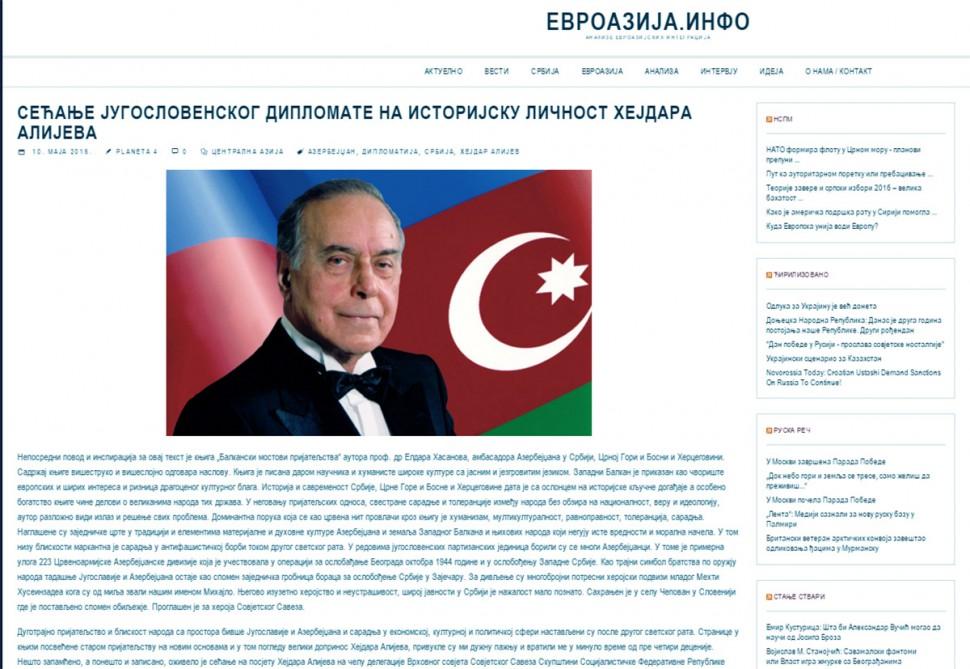 Профессор Будимир Лазович, который в свое время был главой кабинета президента Федерального парламента СФРЮ и послом этой страны в СЭВ, поделился своими воспоминаниями о Гейдаре Алиеве, светлую память которого по случаю годовщины его рождения отметил недавно весь азербайджанский народ (см.:http://evroazijainfo.in.rs/dr-budimir-lazovic-secanje-jugoslovenskog-diplomate-na-istorijsku-licnost-hejdara-alijeva).