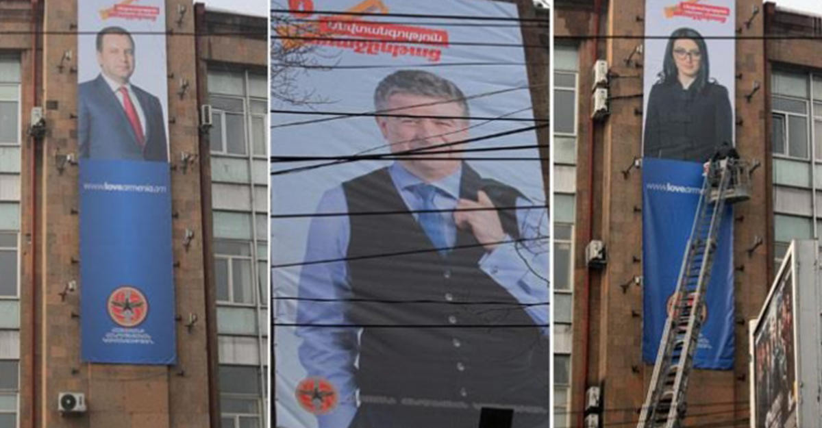 Уже второй день на площади Сахарова висит плакат с изображением премьер-министра Карена Карапетяна, который, однако, не включен в список кандидатов РПА. А на одном из зданий на проспекте Аршакуняц вывешены 10-метровые плакаты с изображениями министра обороны Вигена Саркисяна, возглавляющего пропорциональный список Республиканской партии, и занимающей в нем третье место министра юстиции Арпине Ованнисян.